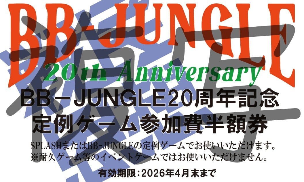 こちらの商品には、BB-JUNGLEおよび姉妹フィールドSPLASHの定例会で使用できる半額券が付属します。